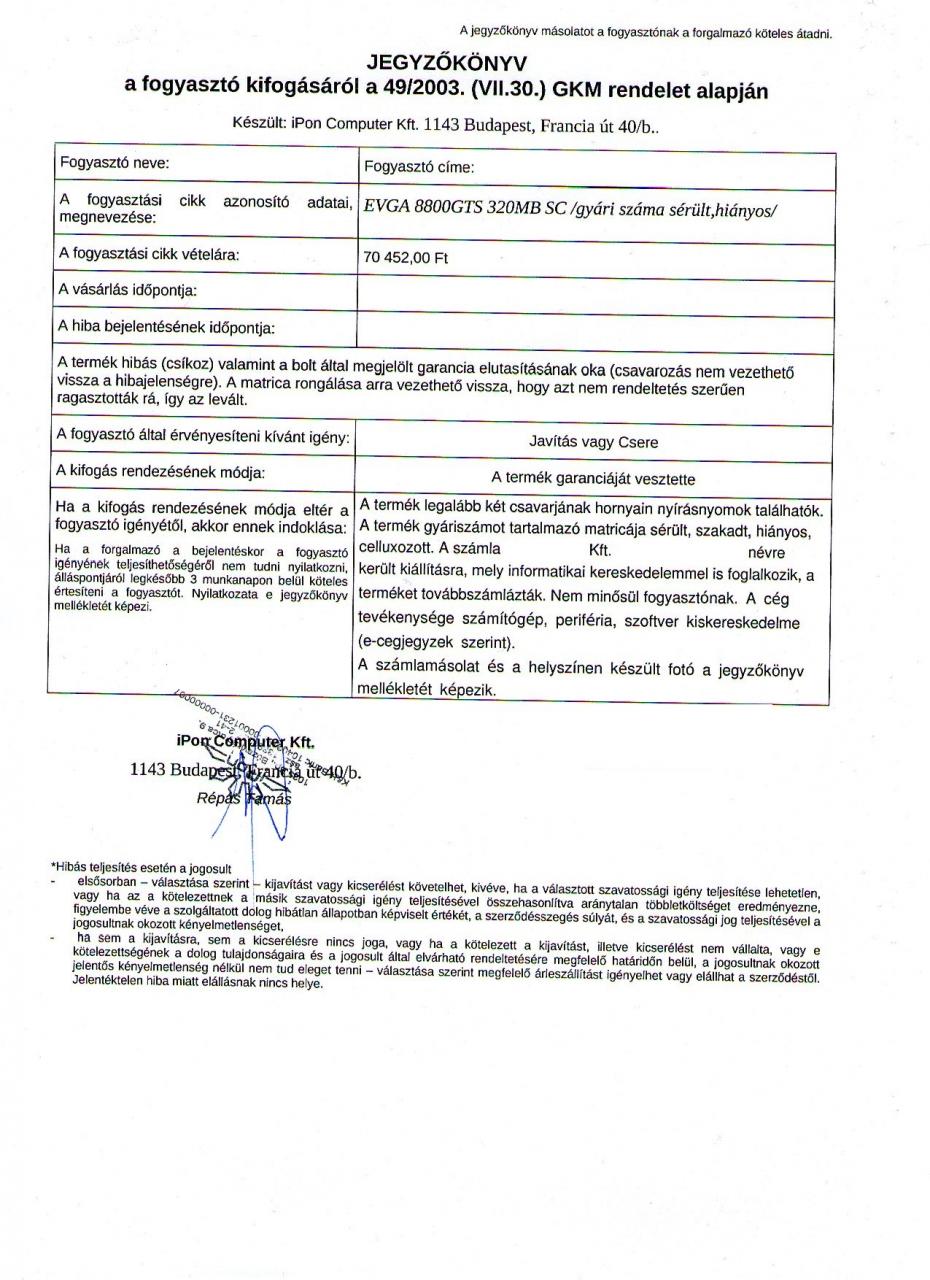 Szintén Telda sorsára jutottam, ugyanis a csere videókártya amit kaptam szintén hibás volt (két gépben is fagyott, ergo biztos a kártya rossz) erre ők megállapították, hogy semmi baja a terméknek. Most a jogi lépések megtétele van soron (még egy fizetési meghagyás előtti ügyvédi felszólítás fog nekik menni, hátha peren kívül meg tudunk egyezni, ellenkező esetben egy 150k-s ügyvédi munkadíjjal és 100k-s igazságügyi szakértői díjjal tűzdelt per következik egy 70k-s videókártya ügyében).