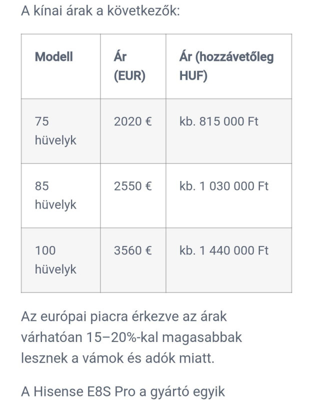 De az is lehet, hogy pontosan az lesz majd, mint az OLED-ekkel amikor bejöttek. Hosszú évekig tartották az árukat. De már csak amiatt is borsos árra számítok, hogy valahogy meg kell különböztetni árcédula szerint is, a sima miniLED tévét az RGB miniLEDtől. Fentebb írták pl, hogy a C8 1M-nál kezdett. Akkor egy RGB miniLED bőven afelett lesz. Én arra számítok, hogy közel egy árban lesznek az OLED-ekkel később is. Aztán majd meglátjuk hogy öregszik ez a gondolatmenetem.