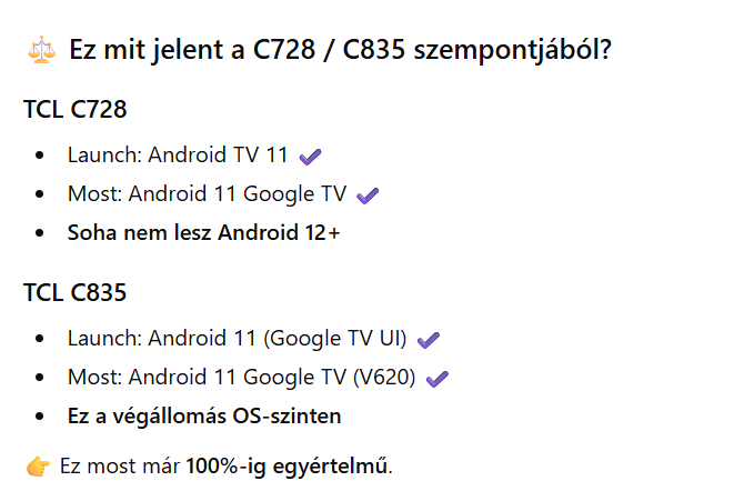 Más.: Én nem érzem szükségét a frissítésnek mivel, szerencsére nekem 'még' nem jött elő semmi zavaró hiba a Q7C-n. Azért kíváncsi leszek, hogy mikor ajánlja fel a tv ezt az android 12-ről 14 re való új frissítést. Az is lehet, hogy ezek amiket itt linkeltek még nem végleges verziók.