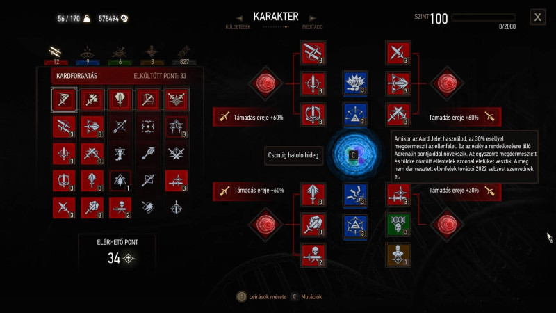 A skill fát kell csak nézni, mivel amit beteszel oda, csak az aktív! Amúgy még az a zöld halálfejes skill fontos, mert az ad +x% (már nem emlékszem) a mutagénre (a nagy piros karikák oldalt) hatást. Illetve tettem a jelek skill-re is Aard-ra és a tűzre főleg, mint ahogy látod, be is vannak téve és a macska iskola kiképzésre mert az is +%-ot ad a macska felszerelés sebzésre, ha jól emlékszem. A nagy középső kör (ahol a C betű van majd a DLC-ben aktiválódik).