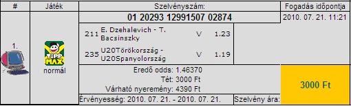 Tét: 3.614 HUFNyeremény: (7.301 HUF)
