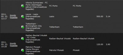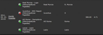 1 meccsre a legnagyobb összeg amit felraktam 30 ezer volt, egy ajándék 2.85x oddsos Juve - Milán meccs volt. Juvéból 7 kezdőjátékos nem játszott, sérülés, és egyéb okok miatt, pedig abban az időszakban jobbak voltak sokkal a Milánnál. A fogadó irodák meg valamiért nem vitték le a szorzót, ezért is mertem rárakni egy 2.85x-ra 30 ezret. Na azóta nem is volt ilyen tuti számomra...A másik meg már ahogy nézegetem Áginak rég szar a hát, pl 2011-04-21 hír: Ági hátsérülése miatt kénytelen volt lemondani a hétfőn kezdődő barcelonai WTA tornát. Rákövetkező hír