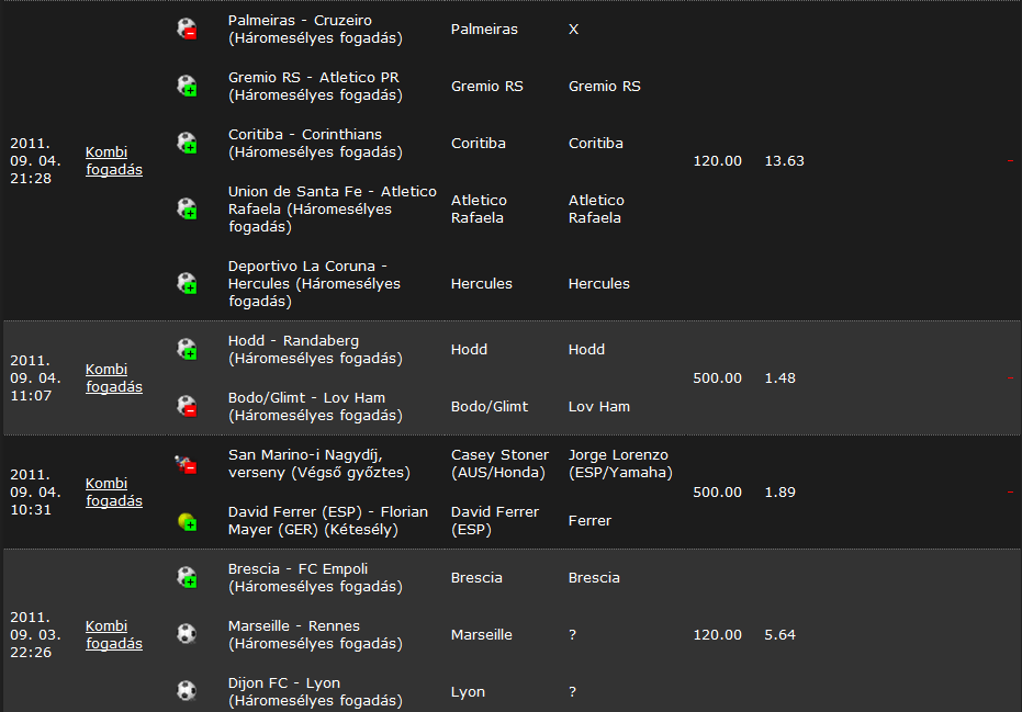 6 meccset tettem meg ma, abból most fejeződik be az 5. Az ötödik meccs a Fluminense - Atlético GO brazil bajnoki. A vendégek már az első félidőben vezettek és a 62. percben 11-essel növelték előnyüket. Már elkönyveltem, hogy ez elment, eredmenyek.com-ról ki is vettem ezt és az utolsó meccsemet. Amikor is visszamentem és láttam, hogy 90. perc: 2-2. Gondoltam lehet még valami, de nekem nincs ilyen szerencsém. Pár percre rá visszamegyek és a hosszabbításban 3-2 a hazaiaknak