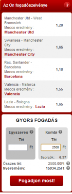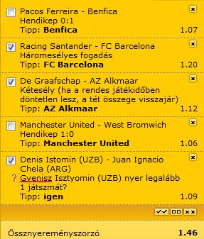 180 (1-0) Betis - Real Madrid V 2.13xelment (3-3) D 3.40x210 Nijmegen - Twente V 1.70x elment (3-1)4.00x226 Swansea - Manchester City V 1.54x elment (1-0)5.90x205 Osasuna - Ath. Bilbao V 2.54x elment (2-1)2.52x212 Novara - Udinese V 1.93x elment(1-0) 3.45xHa így rakom ~700x odds...