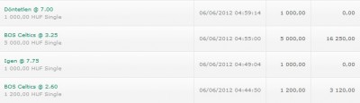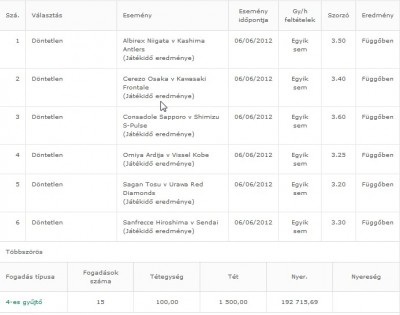 Eddig a "könnyebbik" része jött a dolognak, nagyon nem bánnám ha jönne a többi is. Ferrer-t erős tippnek tartom, a Murrayról való érzéseimet inkább nem írom le, ha megveri Ferrert salakon akkor kitérek a hitemből. A Kashima-t először ikszre néztem, kicsit félek is tőle, de nagyon bízok abban hogy a szorzót nem véletlenül alakítják úgy hogy ők a favoritok. Sampdoria 1-el nyer mindig jó tipp, most meg pláne úgy érzem. Lengyeleknél félidőben már 1:0-t várok (talán végeredménynek is), az Internacional szimpla megérzés (1:0-t várok ott is), a Spanyol meccsen nagyon nem lőhetek mellé a 2-3 góllal (ha csak nem 0:0..), a Magyar meg űrtuti.