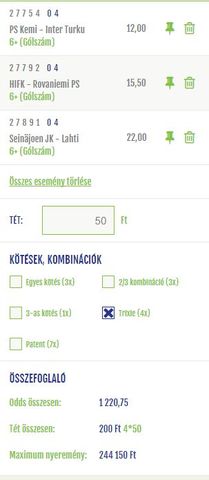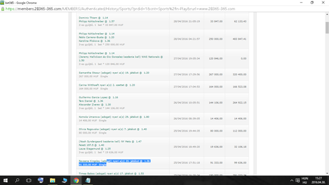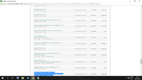 ha jobban megnezitek (legalabbis az utolso oldalon), mindegyik fogadas ido elott lett kiveve. es erre gondoltam mar en is, csak ugy pont ilyen nagy teteknel eri csinalja, 1-2ezressel (szamomra) nem eri meg az idot amit pocsolni kell vele... radob 2 kilot arra, hogy 1.6-ert nyeri a szervajatekat, ha mar 30-15-je van, rogton esik a szoro 1,2-1,3 korulre, 200bol ugye 320 lenne a max nyeremeny, de ekkor neki felajanl mondjuk 240-et, siman kiveszi, nyert 15mp alatt 40et