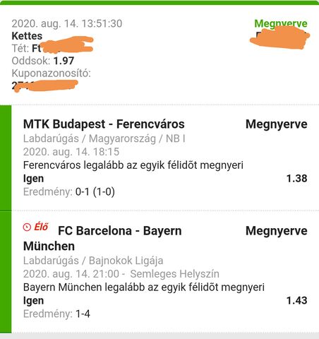 - másik 1436 forinttal meg arra, hogy az első "2 helyezés"-be kerül, vagyis döntőbe jut - ez utóbbira a fentihez képest 1/3-os szorzót, vagyis 7-szereset adnak.Ezért látod azt, hogy az eredő oddsod 41165/2872 = 14,33 körüli, ami pont (vagy kb.) a két szorzó átlaga.
