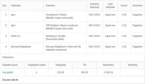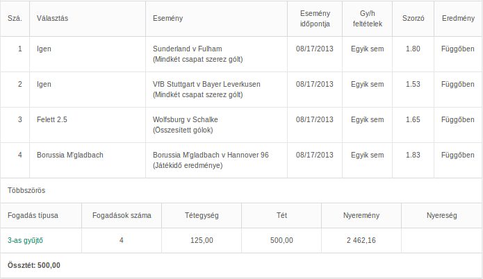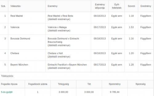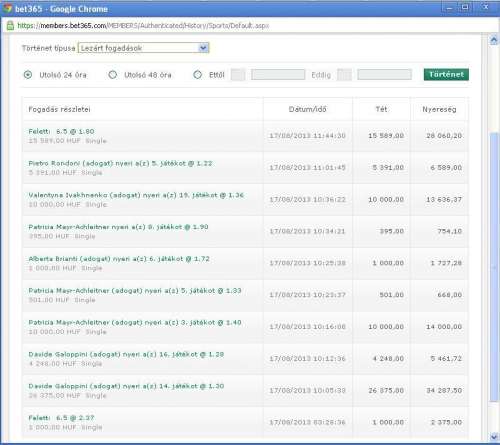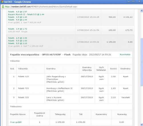 ) nem hiszem, hogy annyira szerencsés volnék, hogy 400K-t nyernék. Az viszont igaz, hogy bölcsebb volna mindig átgondoltan fogadni 1-1 meccsre naponta. A 7,5 overt én már nem raktam meg, ha egy focimeccsen nyerek akkor arra max már csak 100Ftal rakok, a játék kedvéért. -
