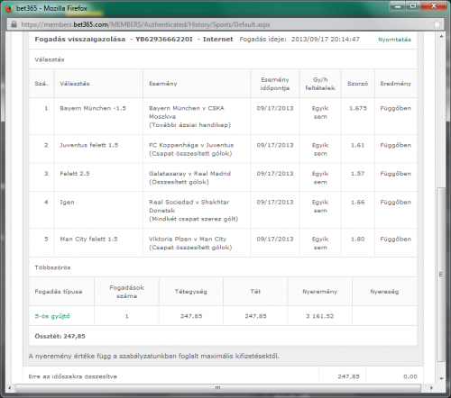 5-ös gyűjtő, 1 bet * 1500,00 HUFBayern München -1.5 @ 1.475