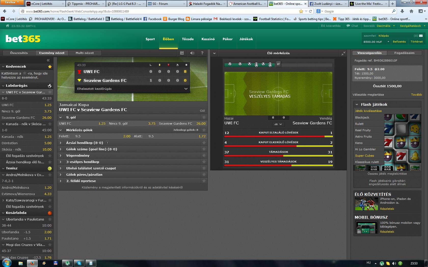 bazze megy egy foci bet365-ön 5-0 volt 30. percben 7,5 overre látom 2,1 az odds na mondom ez nagyon meleg eredmény lehet ha már ekkora a szorzó, aztán 33. percben 6-0.. de a 8,5 over is meglesz szerintem de arra már nem tolok inkább..
