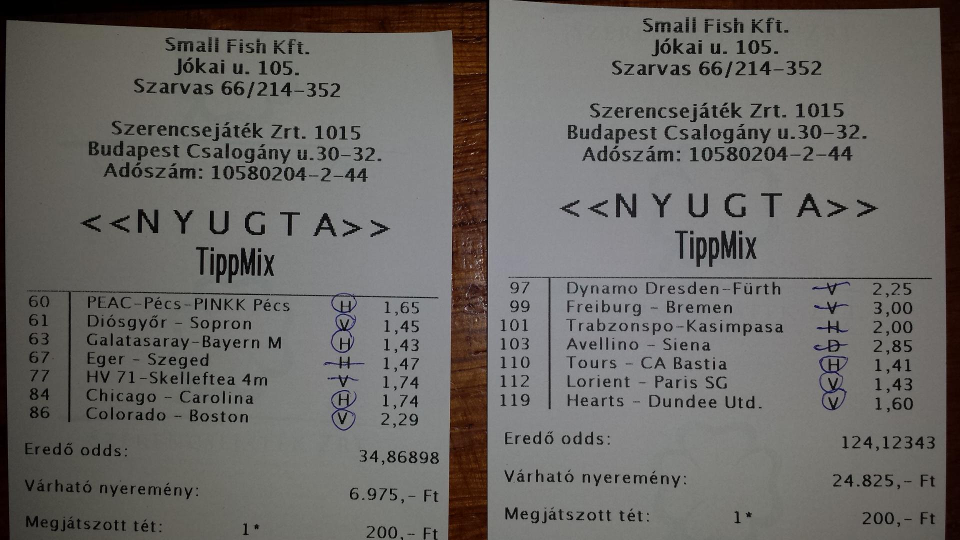 Mai 3/4-es. + szvsz ma csúnyán eladjuk a lelkünket és ki fogunk kapni. Csak kár, hogy 5-ös kötésben lehet megrakni. De 200-al megtolom a fenti 4 tippel együtt. Sose tudni, hátha...