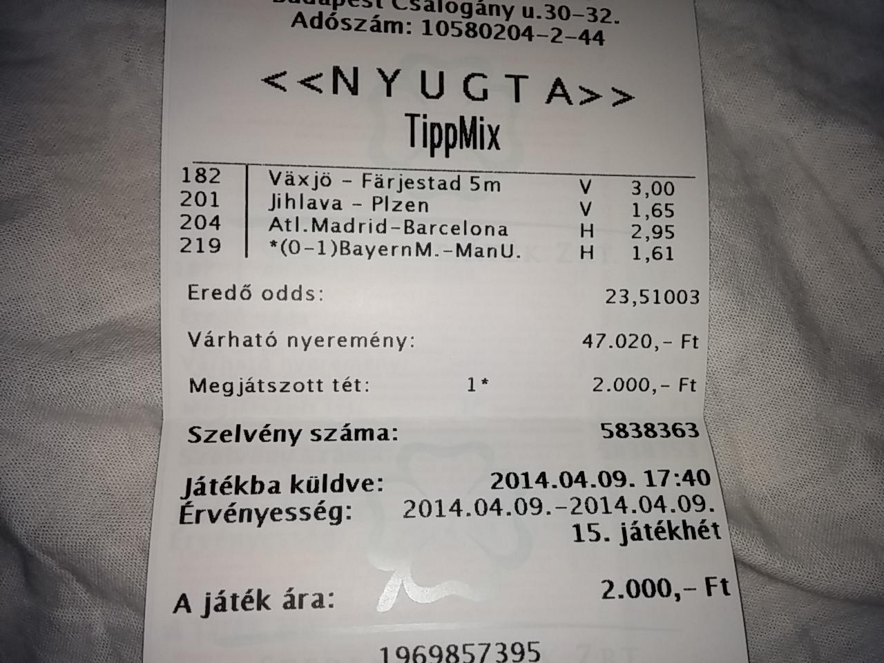 Teljesen mindegy mikor, milyen, hány stb. meccset rakok, mindig el fog menni, mert egyszerűen nem tudok parancsolni magamnak... Éreztem 2 meccset, a Chelsea és Bayern-t, + azt is éreztem, hogy a Barca nem fog nyerni, de volt bennem egy olyan gondolat, hogy hozniuk kell, jó a szorzó, egye-fene, megrakom... És mindig az ilyenek miatt megy el... Na jó, holnap újrapróbálkozás...