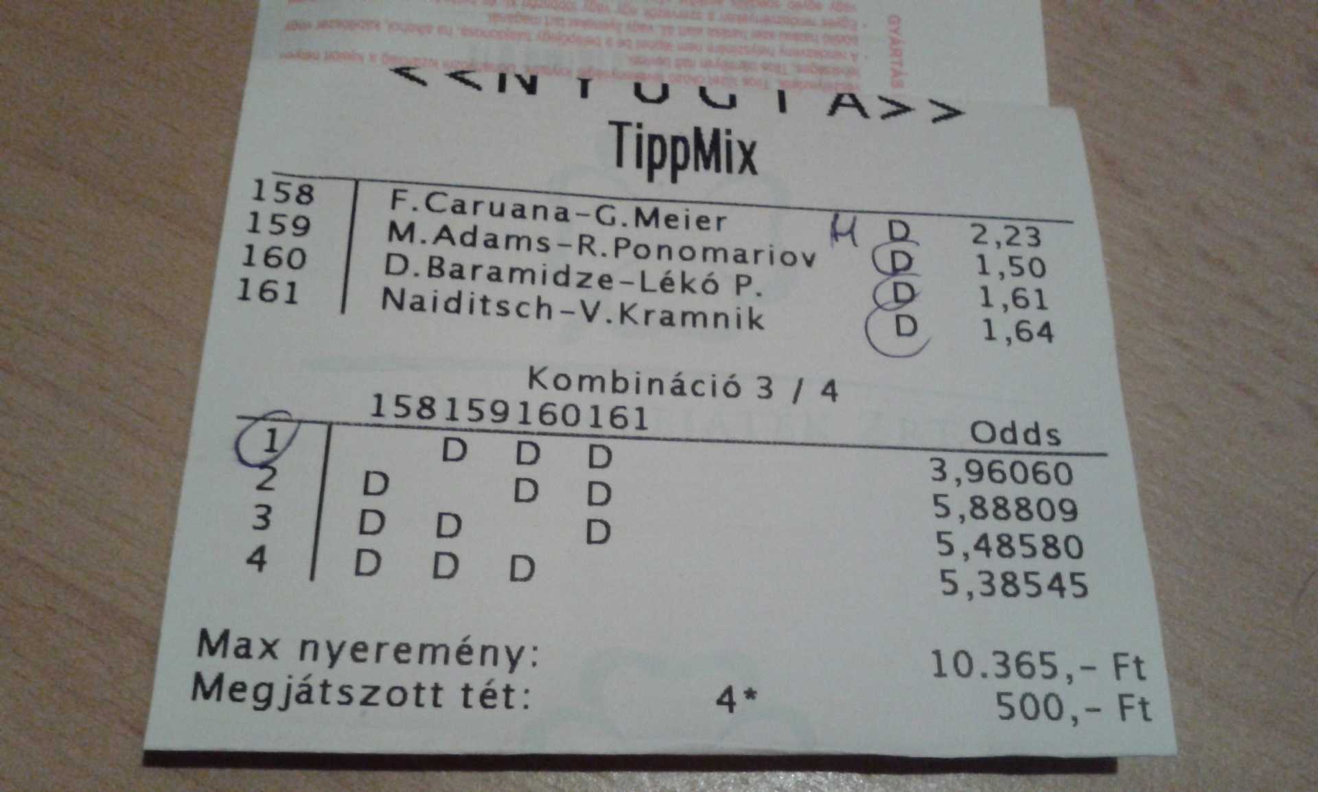 érdemes lesz 2-esével megtenni, mert ugye sakkban nagyobbak a nyert táblák utáni oddsok..lékó, kramnik nyerni fog, (hacsak nem egymás ellen mennek, nem néztem a következő párosítást), a másik 2 meccs közül lesz az egyetlen döntetlen a fordulóban.