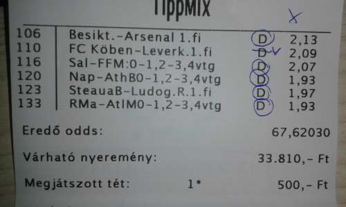 Akkor így tényleg nem sokon múlt, mert Split se volt olyan lehetetlen, meg a HJK is közel volt az X-hez...Így kis szerencsével 6 meglett volna, ami már 162 ezer 6/7-be, neked meg jóval több 5/7-be... -