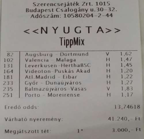 Ja, még annyit, hogy ez a szelvény azért különleges számomra, mert ugye kedvenc csapatra ritkán teszünk, nehogy az érzelmeink elvigyenek, de most nem hagyott cserben se a Dortmund, se a Vasas!