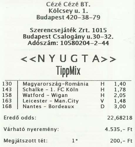 Az öt meccsből, amit megraktam, négynek csökkent az oddsa mixen...a Schalke-é nem, bár ezen csodálkozok, mert a netes oddsokhoz képest a jelenlegi 1.78 már semmi...