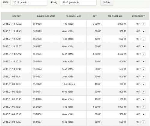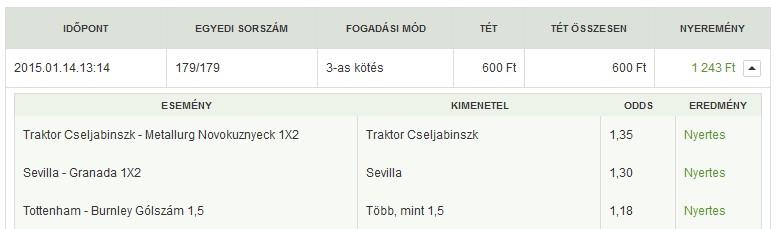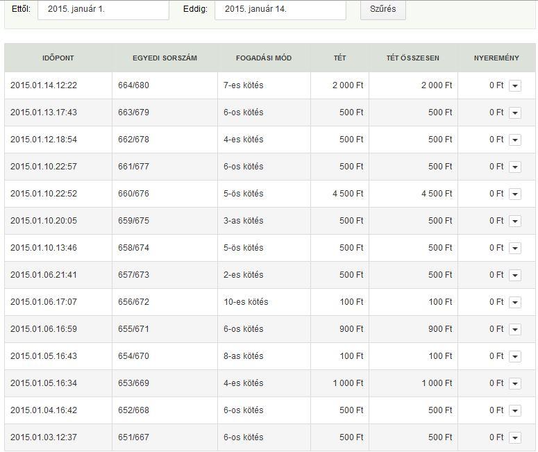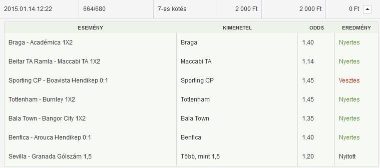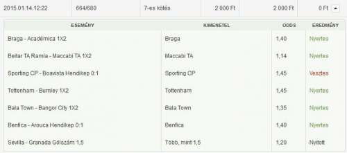 Sajnos még nem teljesen fegyelmezett ez a módszer, mert van hogy rakok napközben, vagy élőben, de eddig pluszos a dolog.11-én indítottam, 2000 ft bankkal, most vagyok 7060 ft-on, szóval eddig a profit már elég szép. Folytatom a bank 5-10%-ával a pár szelvény/nap taktikát. Szelvényenként minimum 2x oddshoz tartom magam. Néha mennek trixiek is, néha azok is betalálnak. Egyébként ha már napi 500huf-ot is tudok hozni nekem elég az is, mert elég sokat játszok. A lényeg inkább abban lenne, hogy huzamos ideig egyenletesen növekedjen a bank, minél kevesebb kockázattal.