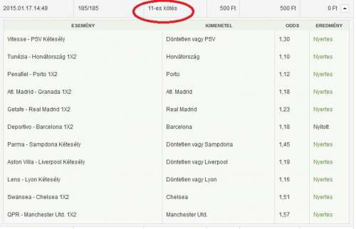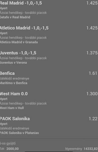 Én azt sajnálom hogy nem mentem el délelőtt feladni egy olyat, hogy minden mai hendivel fogadható meccset megrakni. 7 meccs lett volna és eddig 4 jött, 5. (Barca) jól áll és még lenne a Juve+Merseille.