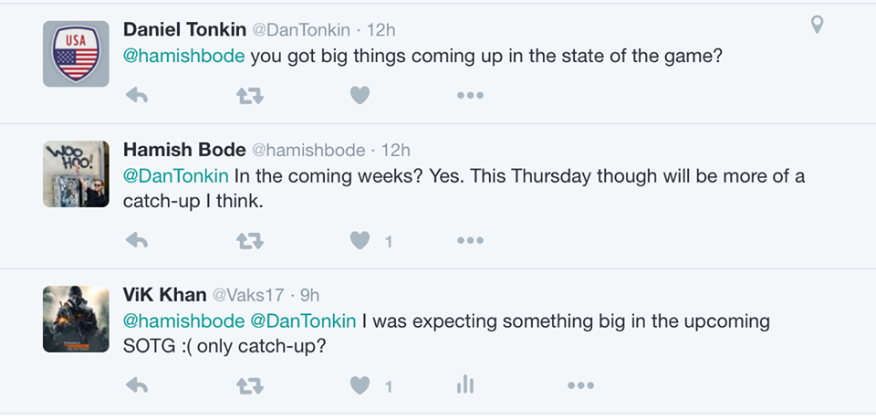 PvE farm vagy küldetés közben vannak kommunikatívabb playerek, azokkal el szoktunk dumálni, hogy mizújs az életben, meg a Divisionben. 95%-k abszolút negatívan nyilvánul meg. Szívesen megnéznék egy közvélemény kutatást, hogy a DZ a jelenlegi és tervezett formájában mennyire jön be a playereknek. Nem csak az aktív playereknek, mert sokan a DZ (és csalók) miatt hagyták abba.Szerk: