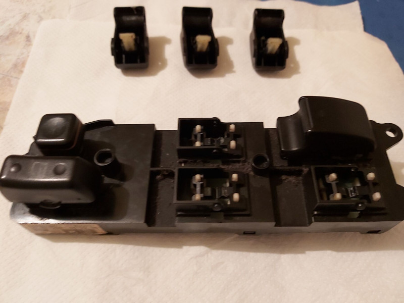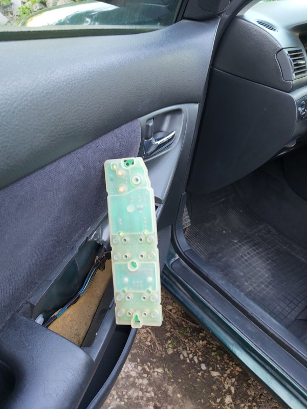 E120-as 1.6 VVTi Corolla ablakmozgató gombjai vagy nem működtek, vagy csak akadozottan. Szétszedés és a nyák megtisztítása után derült ki, hogy a pin-eket kézzel az árakmöri érintkezőkre nyomva minden rendben van. A gond igazából csak annyi, hogy a gombok nem nyomják le eléggé a fehér műanyag "szarvakat", amik aztán nem aktiválják az áramkörön lévő érintkezőket.