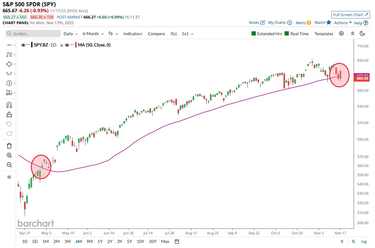 (SPXEW: gyertyák, SP500: lila, mag7 piros)