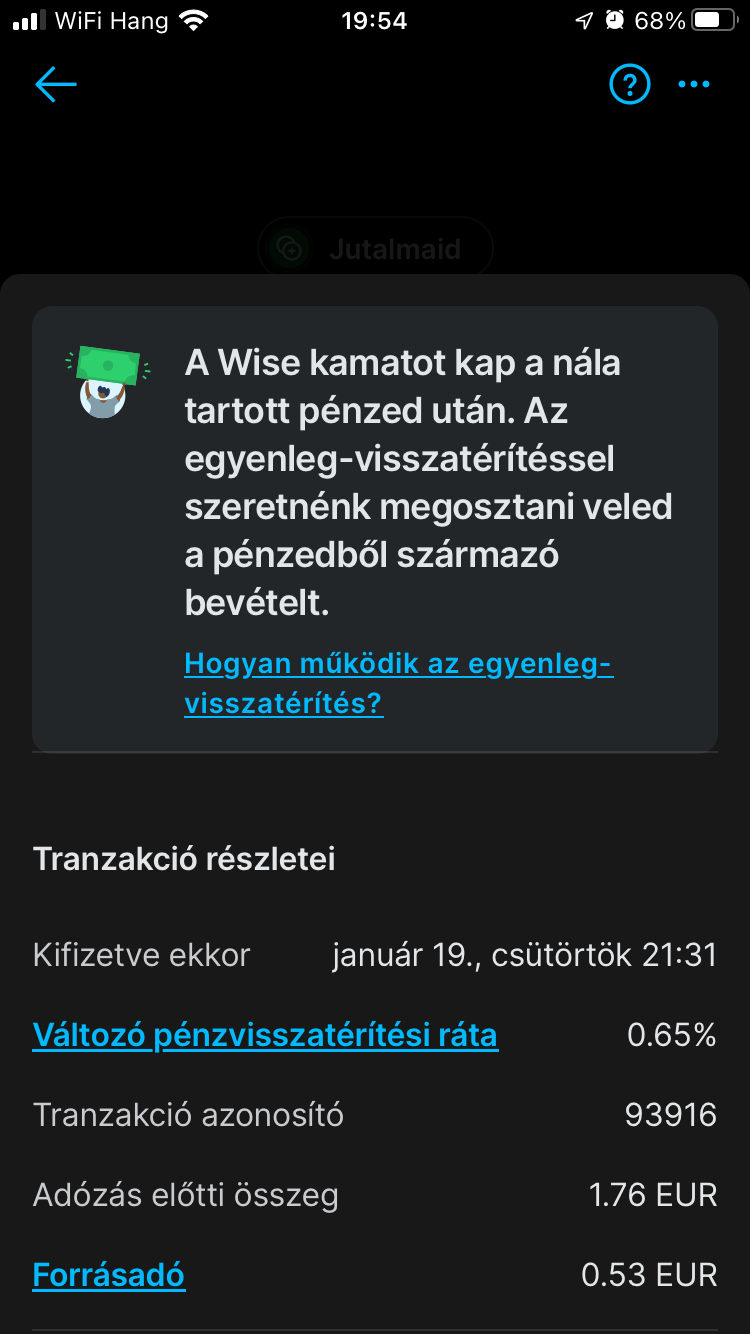 Egyébként sokáig 0%-os volt az euró kamata, ezért a Wise bizonyos összeg felett kezelési költséget szedett be a pénz tárolásáért. Ehhez képest a 0,65% már egy kifejezetten jó látra szóló kamat.