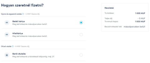 A kártyáról 1500 Ft, utalásnál meg a 0 Ft a TW költsége -