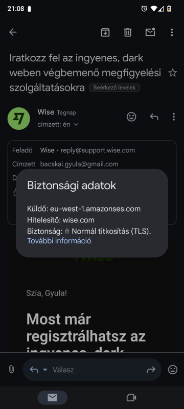 Annyi biztató volt benne hogy a hitelesítő a wise.com volt, csak a sender nem. Korábban a sender mail.wise.com volt.