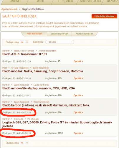 Az első hosszabbítást megcsinálta a rendszer viszont a másodikat NEM.Mind a két hirdetés 2014-01-01 -én járt le tehát ma. Ezután hosszabbítottam 2 szer meg mind a kettőt, de csak az első hosszabbítás látszódik.