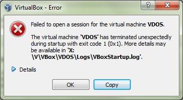 The virtual machine 'VDOS' has terminated unexpectedly during startup with exit code 1 (0x1). More details may be available in 'X:\V\VBox\VDOS\Logs\VBoxStartup.log'.