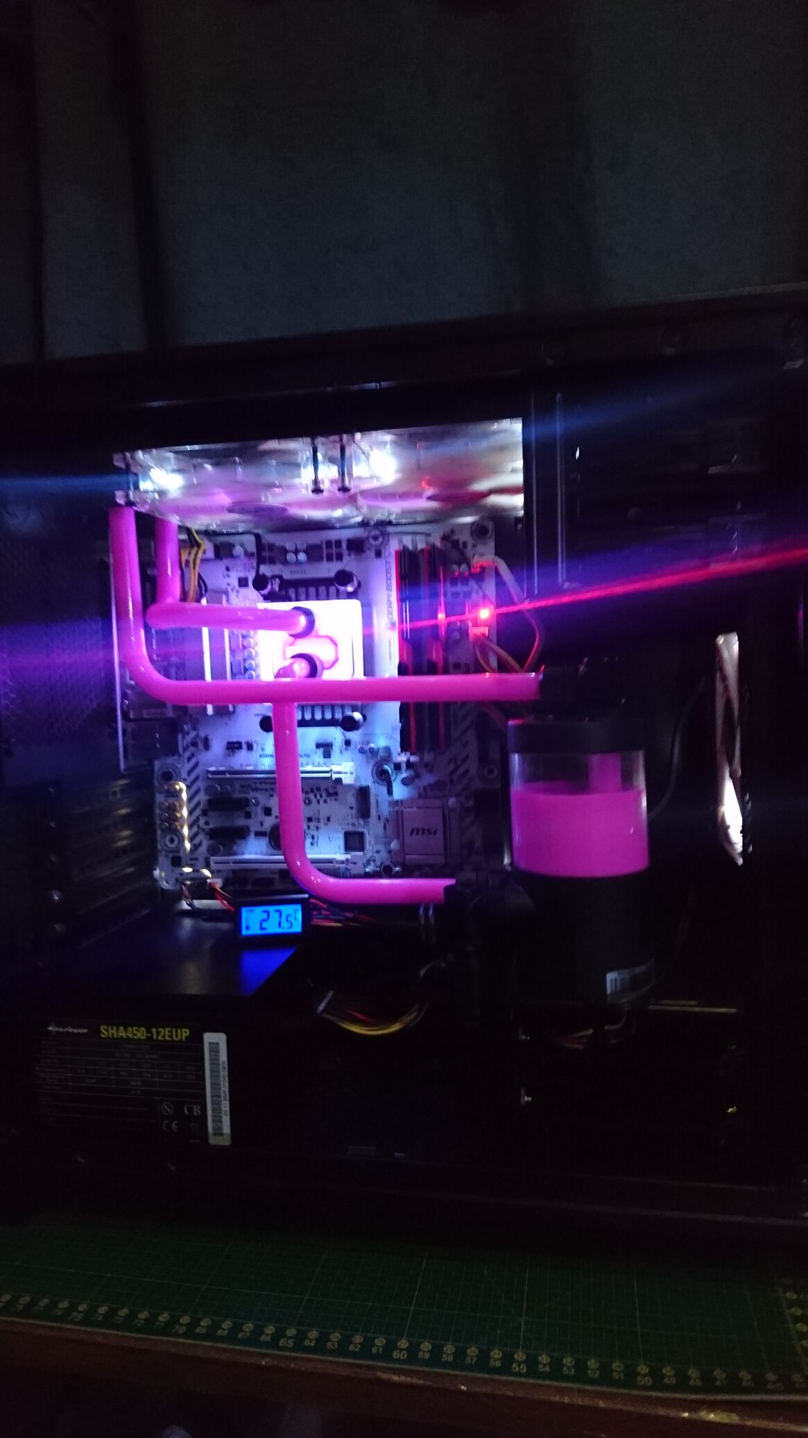 Az alaplap direkt így lett választva,mert eldöntött volt a lötyi szine...Amúgy petg csövekkel van csinálva.XSPC 14/10-es ,alis fittingek,csap.Barrow blokk,240 slim alphacool radi,fehér ventik(radin aerocool,elöl enermax,mindegyik fehér LED-es),magicool dcp 450 pumpa.Ja,és egy Corsair 350D-ben lakik a rendszer.Még egy táp takarót bütykölök majd rá,meg kap fehérre harisnyázott kábeleket-vagy hosszabítókat,ezt még nem döntöttem el.