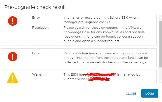 vCenter upgrade 6.0U2->6.7, stage2, pre-check: