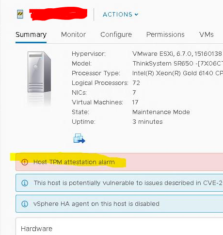 vCenter, ESXi 6.0 -> 6.7 frissítés után TPM hibát jelez a host, bekapcsoltam a secure boot-ot, de lila hál lett az eredménye. Olvastam a zinterneten, hogy le kell törölni azokat a vib-eket, amik miatt nem megy. Ebből nem lesz gond később? Sajnos nem "fényképeztem" le hogy pontosan melyekre panaszkodik.Köszönöm!