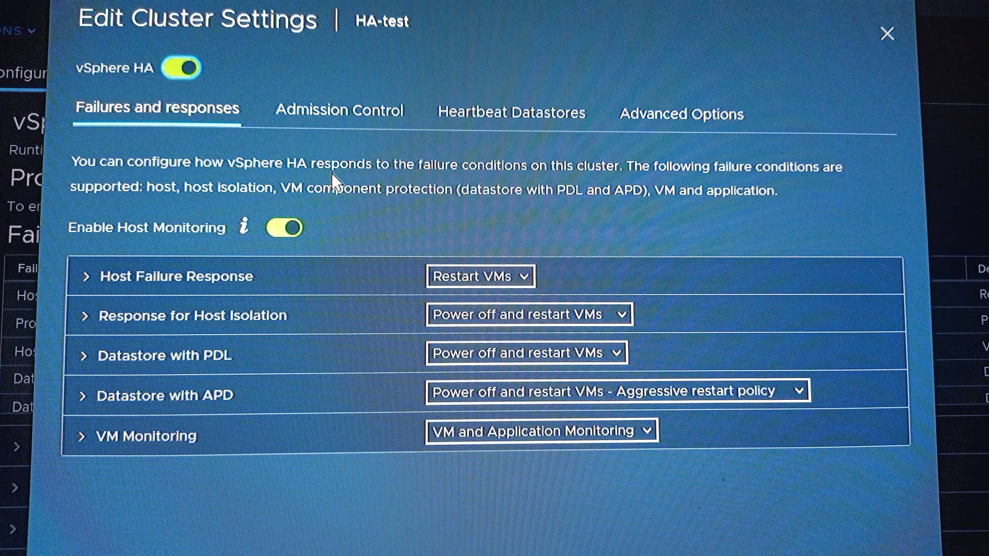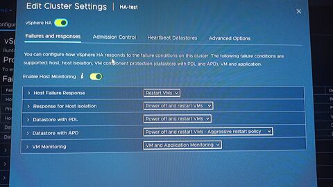 Ezek a beállítások. Admission controll jelenleg ki van kapcsolva, így nem jön perma alarm, hogy insufficient HA resources.Ezt egy 100tb-os LUN- 12 DELL blade-es clusterre is írja, ha be van kapcsolva.
