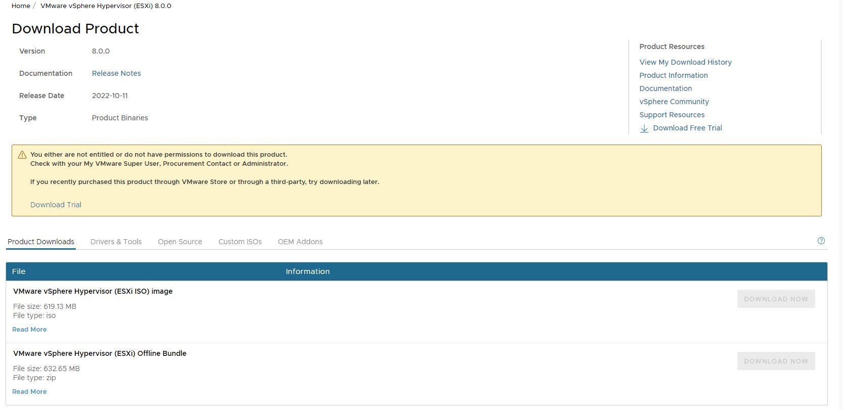 Jelenleg 6.5.0 (Build 4887370) van telepítve free licensz kulcs is megadva rendben működik. Szerettem volna Update 1-re frissíteni. Gondoltam leszedem az ISO-t és újratelepítem. De nem engedi letölteni. Amikor bejelentkezek és rámegyek a letöltő oldalra akkor ez jelenik meg. De semmi magyarázatot nem találok rá, hogy miért. A másik ha bemegyek a myvmware-be ott látszik a ESXI 6 kulcsom, meg az eddigi letöltések, onnan sem tudok továbblépni. Hogyan tudok hozzájutni az ISO-hoz?