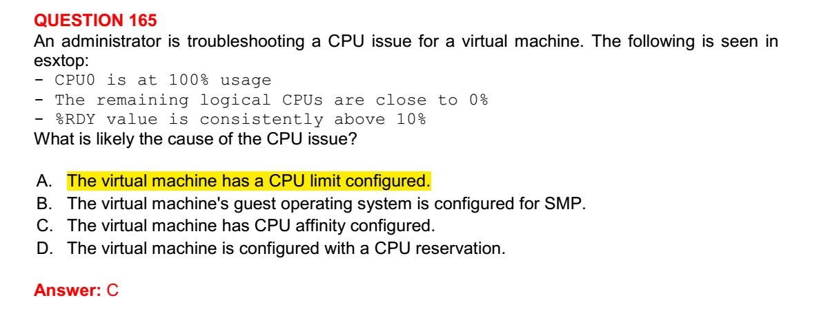 a VM-hez több vCPU lett rendelve, de a benne futó applikáció csupán egyetlen vCPU-t tud értelmesen kihasználni, azt 100%-ra pörgeti, a többi 0-n marad. A VM futását egy CPU limit korlátozhatja, amit a CPU0 ki is max-szol.'C'