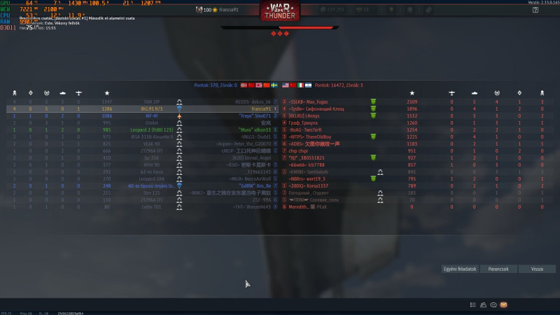 Ugyanazokkal a tankokkal tegnap mentem előre mint kés a vajban. Repülőkkel ugyanez Jaguar IS-el szedtem a népet csokorba. Átmentem Arcade-ba ott is sikeres voltam kisebb BR-ben. Nem tudom mi az oka annak, hogy 1-1 nap semmit sem tudok csinálni máskor meg szinte amit eltalálok az kill. -