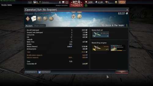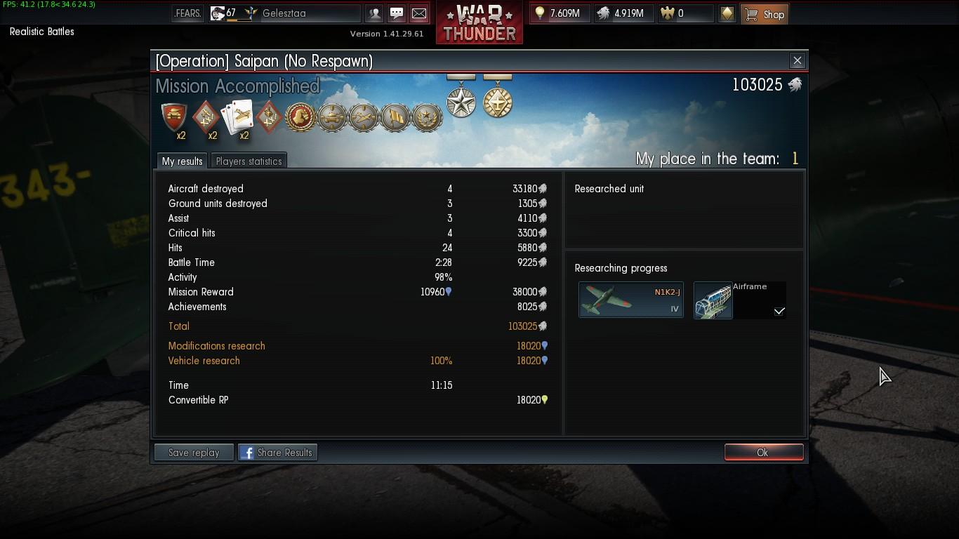 Az első Hellcatet a csapattárs N1K szedte le, én váltottam a másikra amint bemondta a chatbe, hogy kit támad. Csak hitelni tudtam sajnos, visszamásztam picit, újból megtámadtam a Hellcatet, aki éppen stallközelben volt, 2. kill. Amint ez megtörtént, megtaláltam az első B-24-est, akire rácsaptam, felégettem és ez elég is volt a kinyírásához szerencsére, 3. kill. Felvillant a következő B-24-es is, aki a repterünk felé tartott, muszáj voltam megtámadni mert csak 400 vagy 500 ticketünk maradt a bombázásuknak köszönhetően. Első támadás sikertelen, semmi kritikus sérülés neki. Totál függőleges mászásba kezdtem, hogy minél kevesebb lövésznek legyen kitéve a gépem, majd vissza ráfordultam és felkészültem, hogy belevezetem a gépem, ha sikertelen lesz a támadásom. Lövöm-lövöm, bumm, az egész gépe darabokra szakadt, mondom ok, 4. kill o.O