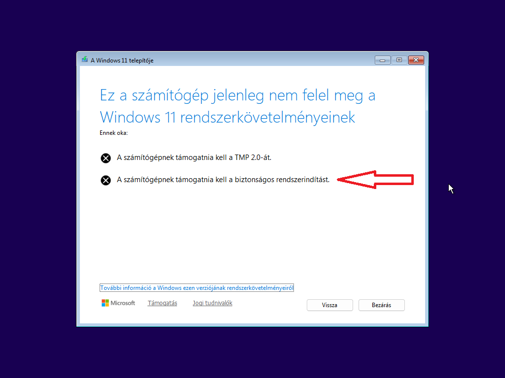 Legacy (CSM) módban bootolva és telepítve eleve leáll a Windows 11 telepítője hibaüzenettel / hibaüzenettel, úgy alapértelmezetten nem is lehet telepíteni, max. trükközéssel.