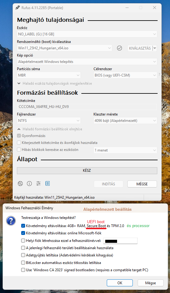 Core i5 11- gen, ASUS lap, 500GB SATA ssd nullázva, utolsó build letöltve, usb telepítőre iratva rufus-al...