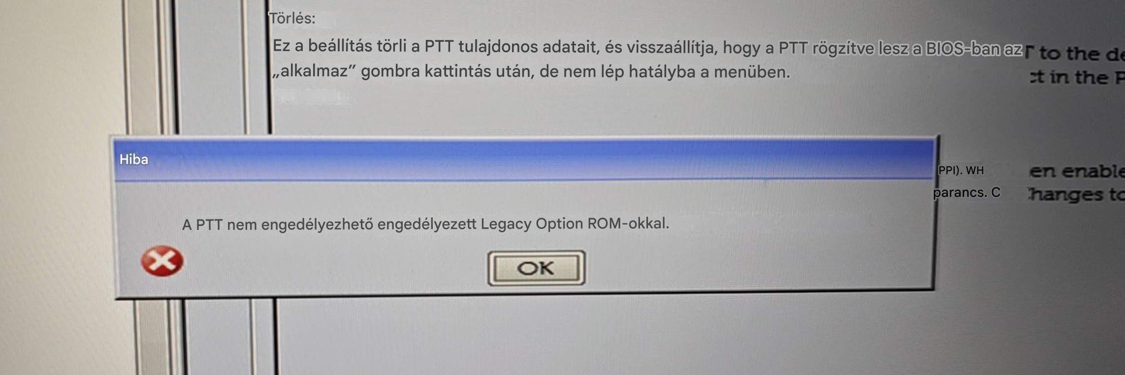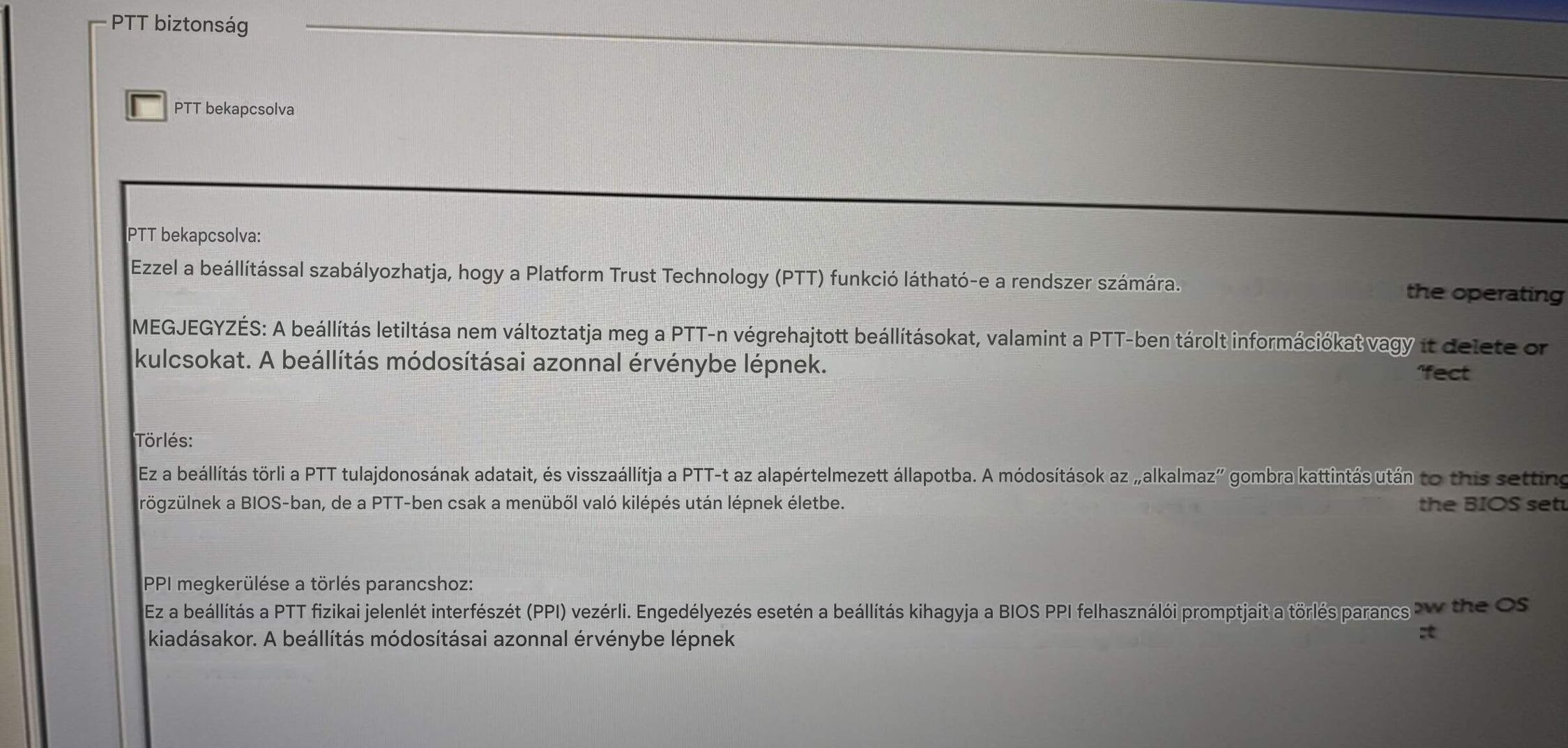 A dell azt írta hogy a TPM 1.2-t támogatta régen is, a jelenlegi pedig tudja a 2.0 is csk nem tudom mikeressek állítani ha ezt a PTT nem engedi valamiért. Ezelőtt ment rajta a win11, de frissített a BIOS, azóta csak a 10 megy emiatt.