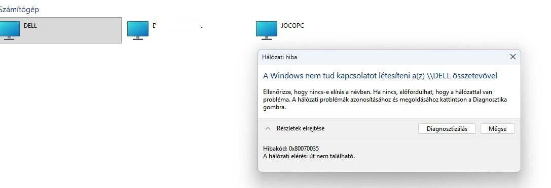 Mindkét gépnél a Sajátgépnél a hálózat résznél látom a gépeket, ellenben ez fogad : [kép]