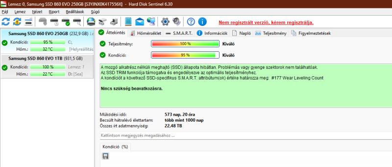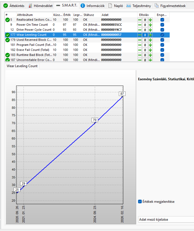 Nem tartom valószínűnek, hogy a HD Sentinel által megadott 116 nap hátralévő idő valós lenne.Azt meg tudod nézni, hogy grafikonon mit mutat a wear leveling?