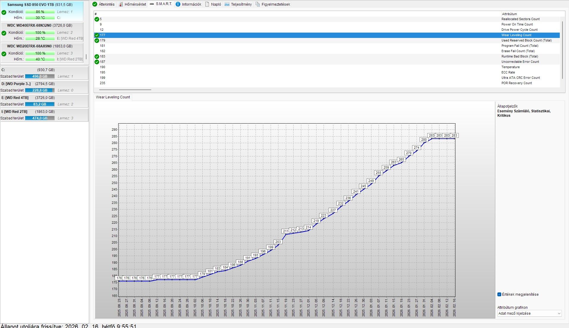 Nálam 283. Most nézem, mintha memória bővítés után megállt a romlás. Nekem azért ilyen sok az írás, mert torrentnél régebben átmeneti tárnak használtam az SSD-t, mert valami gond volt a HDD-vel, direktben mentve nagyon belassult. Ki kellene már az SSD-t cserélni, csak nincs kedvem újratelepíteni mindent. Egyébként, hogy áll meg az SSD, egyszer csak nem indul a rendszer vagy van valami előzmény? Biztonsági másolat van a fontos dolgokról.