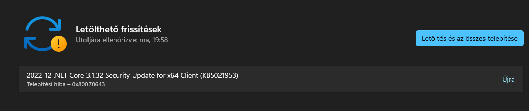 • Nem derült ki, hogy mi a hibakód a sikertelen frissítésnél, anélkül nem egyszerű kideríteni a hiba okát. De amúgy vannak általános megoldási javaslatok Windows Update problémára (példa).