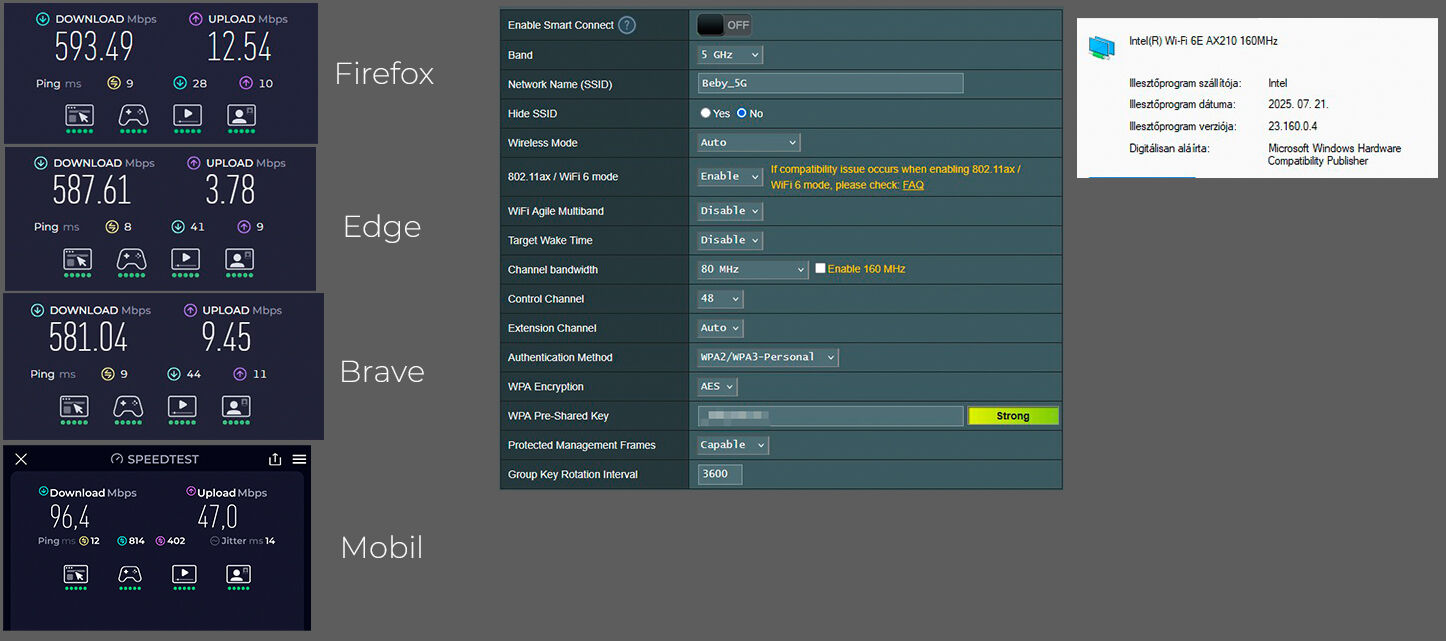 A teszt 3 böngészővel és mobilról, mind az 5G-s hálózaton. A házban nincs más 5G-s wifi. [kép]