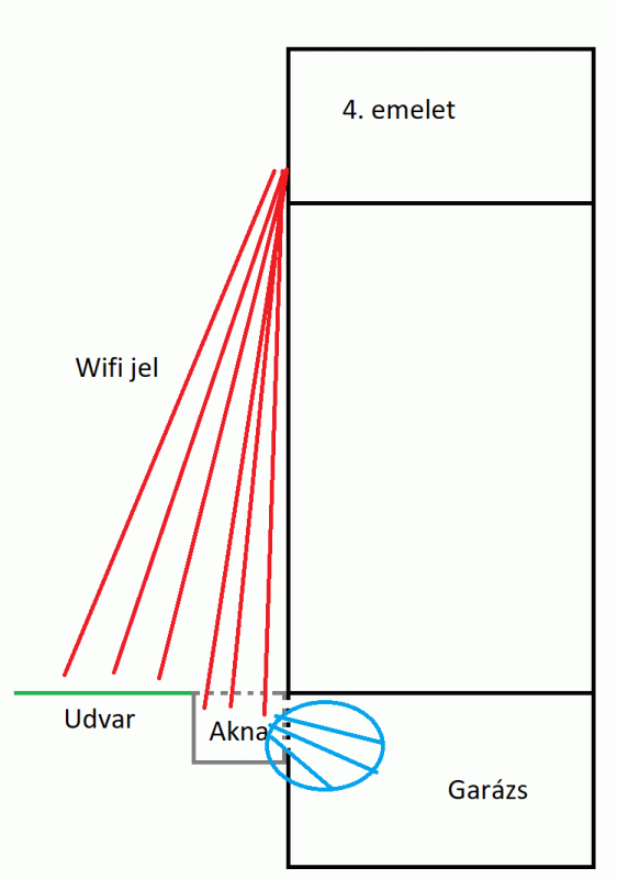 Társasház negyedik emeletén lakom, -1-re, a mélygarázsba szeretnék wifit varázsolni (kábelen nem tudom levinni) - hevenyészett rajz alább. Az udvaron van pár rácsos szellőzőakna (felülről és oldalra a garázsba átjárható), amin keresztül gondoltam, hogy le tudom juttatni a jelet. Egy TP-LINK EAP110-Outdoor WiFi Access Pointtal próbálkoztam, ami a teraszról szórja jelet lefelé. Az udvaron fullos vétel van, sőt, még az akna felső harmadában is tűrhető, utána viszont teljesen elnyeli a jelet a betonfödém. Olyan megoldást keresek, amivel a hiányzó, durván 2 métert át tudnám hidalni. Egy outdoor range extenderre gondoltam, amit beteszek szellőzőbe, így az annyira fel tudja erősíteni a jelet, hogy a szellőzőtől mondjuk 1 méterre vehető legyen.