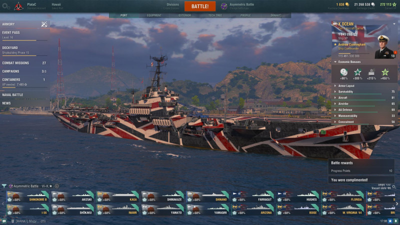 Én abszolút hétköznapi játékos vagyok, most free XP-ből vettem meg a Sekiryu-t. Csak annyit hajóm van amivel szeretek játszani és szoktam is. A többi nekem felesleges és eladogatom. Most is van 2-3 hajó amit tudok mellőzni, de most tartogatom még azokat. Satsuma, Gr. Kurfürst, U-4501, Venezia, Malta meg most ez a Sekiryu. Ezekkel játszom leginkább.