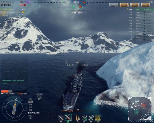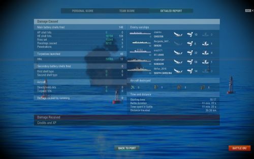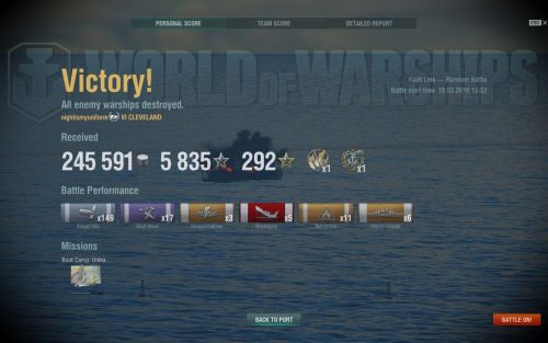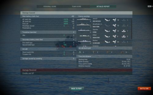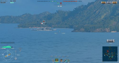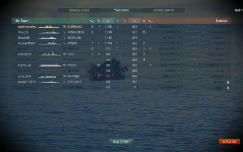 Most még olyan is volt, hogy torpedóm ment át csatahajó közepén, és folytatta útját tovább, békésen..Előbb mentem.. Cleveland, az mindig fun. Volt velem egy másik Cleve, és egy Nürnberg. Ellenséges Fusot támadtuk, 80+ HE lövésem találta el, 0 tűz. Figyeltem arra, milyen szöget zárok be vele, hogy ne mutassam az oldalam (de az orrom sem, mert akkor az AP hosszában cseszi szét a hajót), ráadásul kanyarogtam is egy kicsit, hogy véletlen se legyek ideális célpont.. teljesen mindegy, első salvoja hp-m fele, másosik salvoja a másik fele.