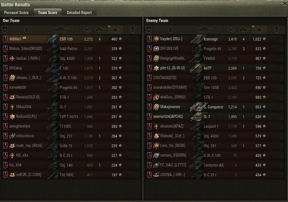 Kharkov-on meg kifogtam egy olyan csapatot amit 15-0-ra ledarált az ellenfél, második lettem xp-ben és egy ilyen 45%-os ebr lett előttem az első akinek a játékát megcsodálhattam a csata végén. Konkrétan az is nehézséget okozott neki hogy vezesse a tankot, össze-vissza ment mindennek neki, az ellenfél bázisánál kóválygott és láttam ahogy szépen kigurult egy jpe100 elé aki lőtt neki egy 0 dmg-es kritikust.